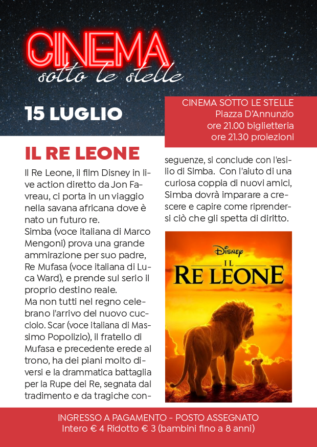 La programmazione è, per scelta dell’Amministrazione comunale, dedicata in particolare ai più piccoli, ma piacevole anche per tutta la famiglia. Primo film ad essere proiettato giovedì 15 luglio sarà IL RE LEONE, film Disney girato con la tecnica live action, al quale seguiranno, giovedì 29 luglio ONWARD –Oltre la Magia e giovedì 5 agosto FROZEN 2. Per la serata conclusiva il 19 agosto andrà invece in scena l’ultimo film Commedia di Checcho Zalone, TOLO TOLO.