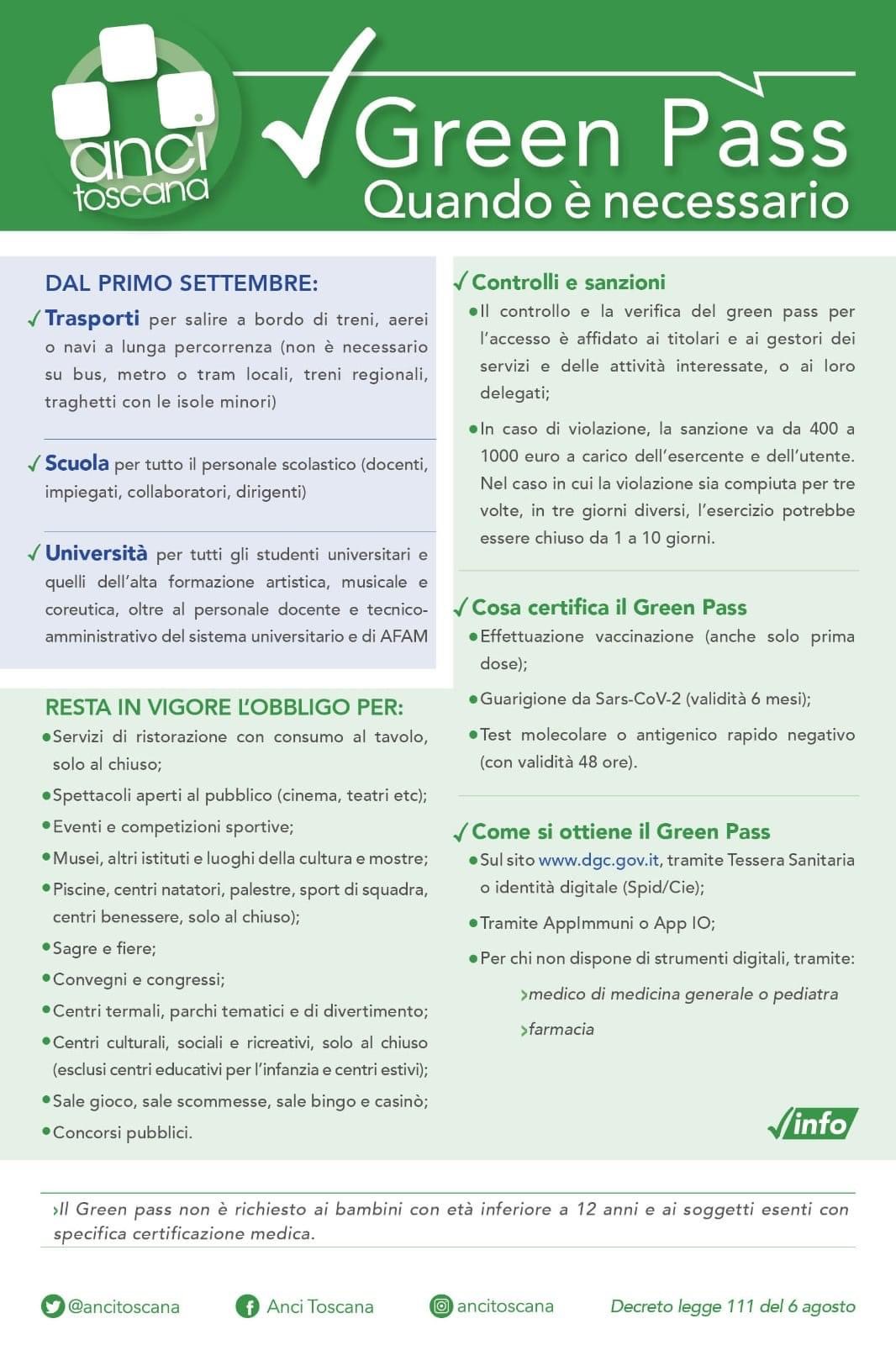 Dal 1° settembre il Green Pass, sarà obbligatorio anche per scuole e trasporti. La scheda allegata raccoglie in sintesi le novità e le norme già in vigore.
