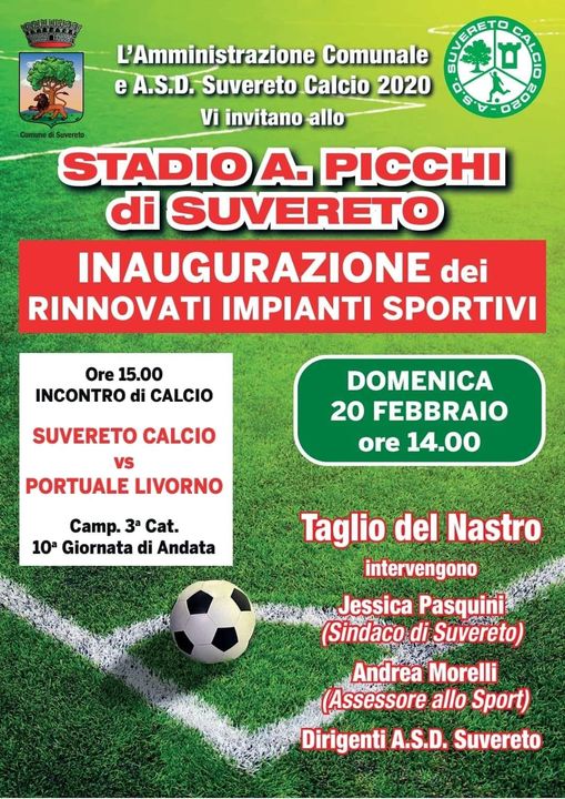 DOMENICA 20 FEBBRAIO l'ASD Suvereto Calcio 2020 riprende il campionato disputando la prima a partita in casa allo Stadio A. Picchi!