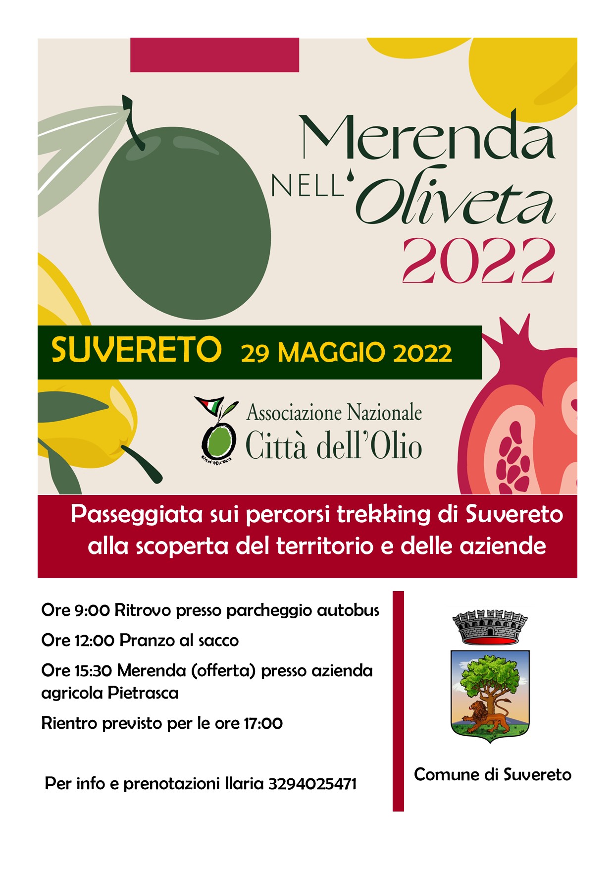 In occasione dell’edizione 2022 della MERENDA NELL’OLIVETA , l’evento ideato dall’Associazione nazionale Città dell’Olio, per promuovere il turismo dell’olio nei borghi d’Italia, il Comune di Suvereto organizza: