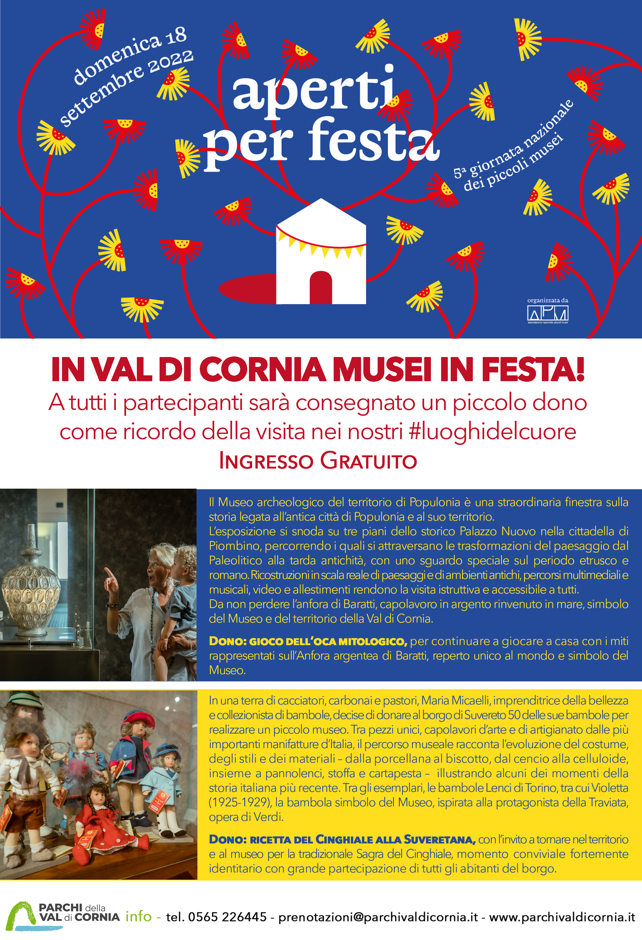 Si svolge domenica 18 settembre 2022, la Giornata nazionale dei Piccoli Musei “Aperti per festa”. A tutti i visitatori sarà consegnato un piccolo dono come ricordo della loro visita ai nostri luoghi del cuore con ingresso gratuito per tutti. La manifestazione si svolgerà in tutta Italia su iniziativa dell'Associazione nazionale Piccoli Musei con lo scopo di fare conoscere e valorizzare i siti culturali che pur con dimensioni ridotte costituiscono realtà culturali di grande valore.