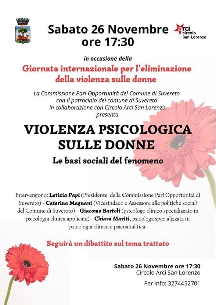 In occasione della ricorrenza del 25 Novembre, giornata internazionale per l'eliminazione della violenza sulle donne, la Commissione pari opportunità del Comune di Suvereto, in collaborazione con il Circolo Arci San Lorenzo che ospita l'iniziativa, organizza per il giorno