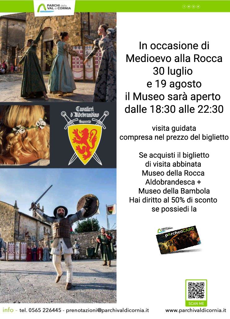 In occasione dei due eventi programmati per domenica 30 luglio e sabato 19 agosto al nuovo accampamento medievale, l'adiacente Museo della Rocca sarà aperto eccezionalmente dalle 18.30 alle 22.30.
