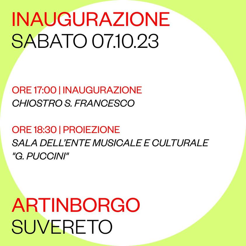 L’apertura ufficiale di ArtinBorgo 2023 si terrà sabato 7 ottobre 2023. Alle ore 17:00 ci sarà l' Inaugurazione e presentazione del Festival al Chiostro S. Francesco mentre alle ore 18:30 verrà proiettato il film documentario sulla manifestazione ideato e realizzato da Marco Bacci, con la collaborazione di Elia Pancotto presso la Sala dell’Ente Musicale e Culturale “G.Puccini”.