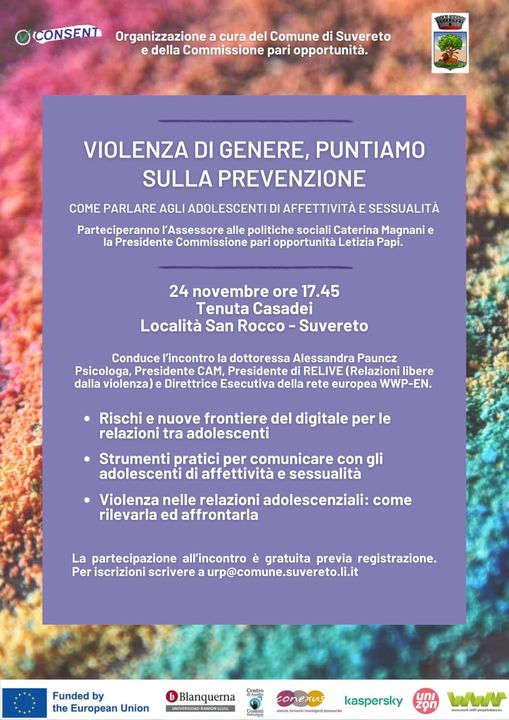 In occasione della giornata internazionale contro la violenza sulle donne, Comune e Commissione Pari Opportunità propongono un incontro pubblico che verte su come parlare agli adolescenti di affettività e sessualità.