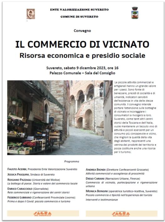 Sabato 9 Dicembre alle ore 16 la sala consiliare del Comune di Suvereto ospita il convegno di sagra dedicato a Il Commercio di Vicinato, Risorsa economica e presidio sociale.