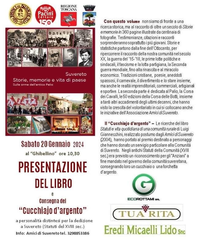 Sabato 20 Gennaio alle ore 10,30 presso il Ghibellino, l'associazione"Amici di Suvereto" presenta la pubblicazione "Suvereto. Storie, memorie e vita di paese", patrocinata da Comune di Suvereto e Regione Toscana.