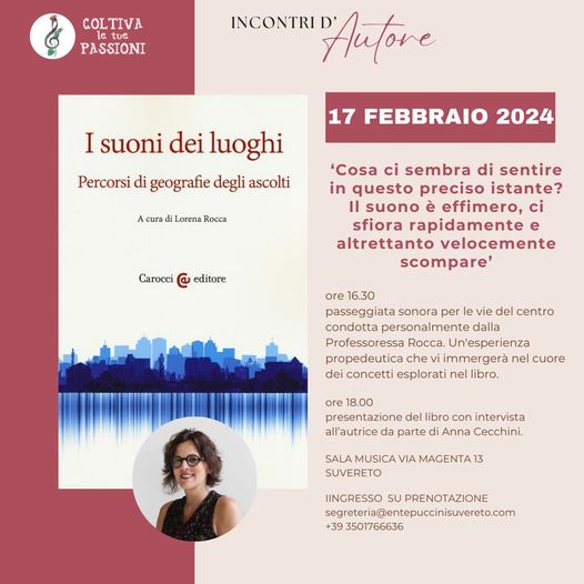 Sabato 17 Febbraio l'Ente Musicale Puccini di Suvereto organizza una iniziativa da non perdere: la presentazione del libro ''I suoni dei luoghi'' della Prof.ssa Lorena Rocca, docente di Geografia umana e Didattica della geografia all’Università degli Studi di Padova.