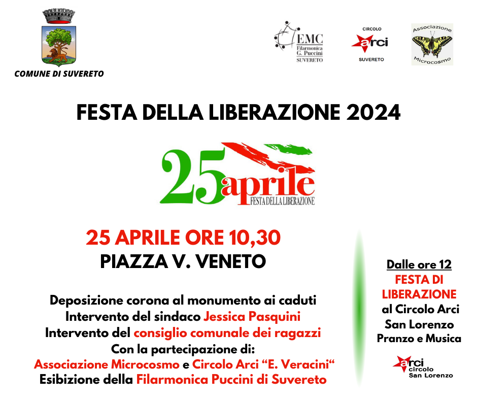 In occasione della Festa di Liberazione 2024, il Comune di Suvereto rende noto il programma delle celebrazioni che si svolgeranno nella mattina del 25 Aprile in Piazza Vittorio Veneto.