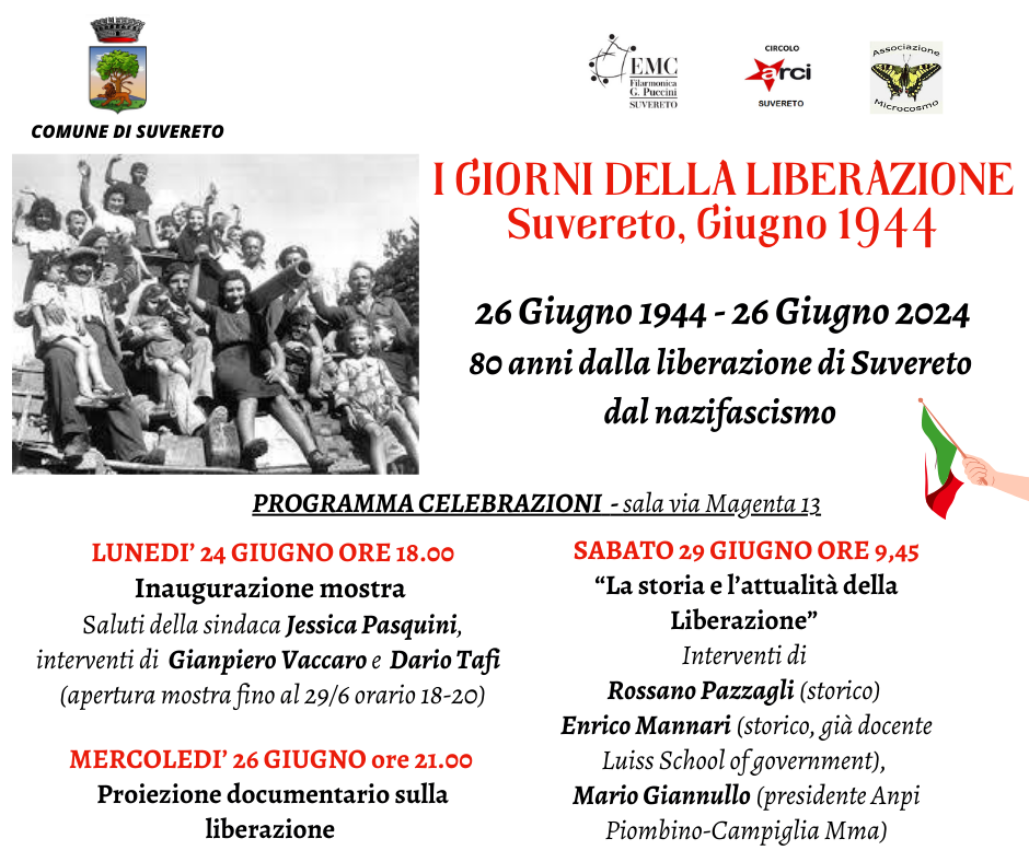 A 80 anni di distanza, Il Comune di Suvereto ricorda quei giorni della liberazione dal nazifascismo con un programma di iniziative in collaborazione con Circolo Arci Veracini, Associazione Microcosmo ed Ente Puccini.