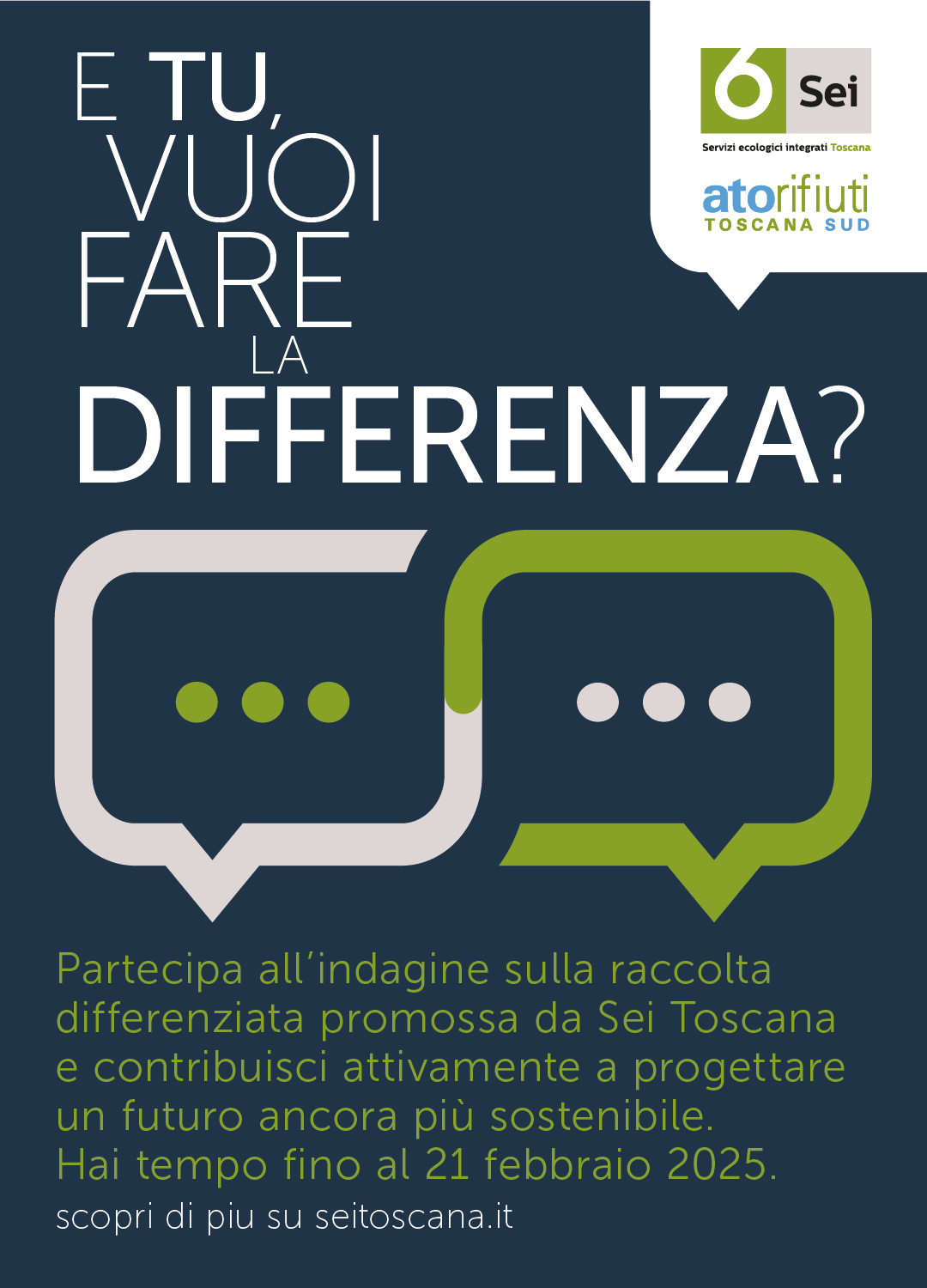 È lo slogan della nuova campagna promossa da SEI Toscana. C'è tempo fino al 21 Febbraio 2025 per partecipare all'indagine sulla raccolta differenziata per un futuro ancora più sostenibile.