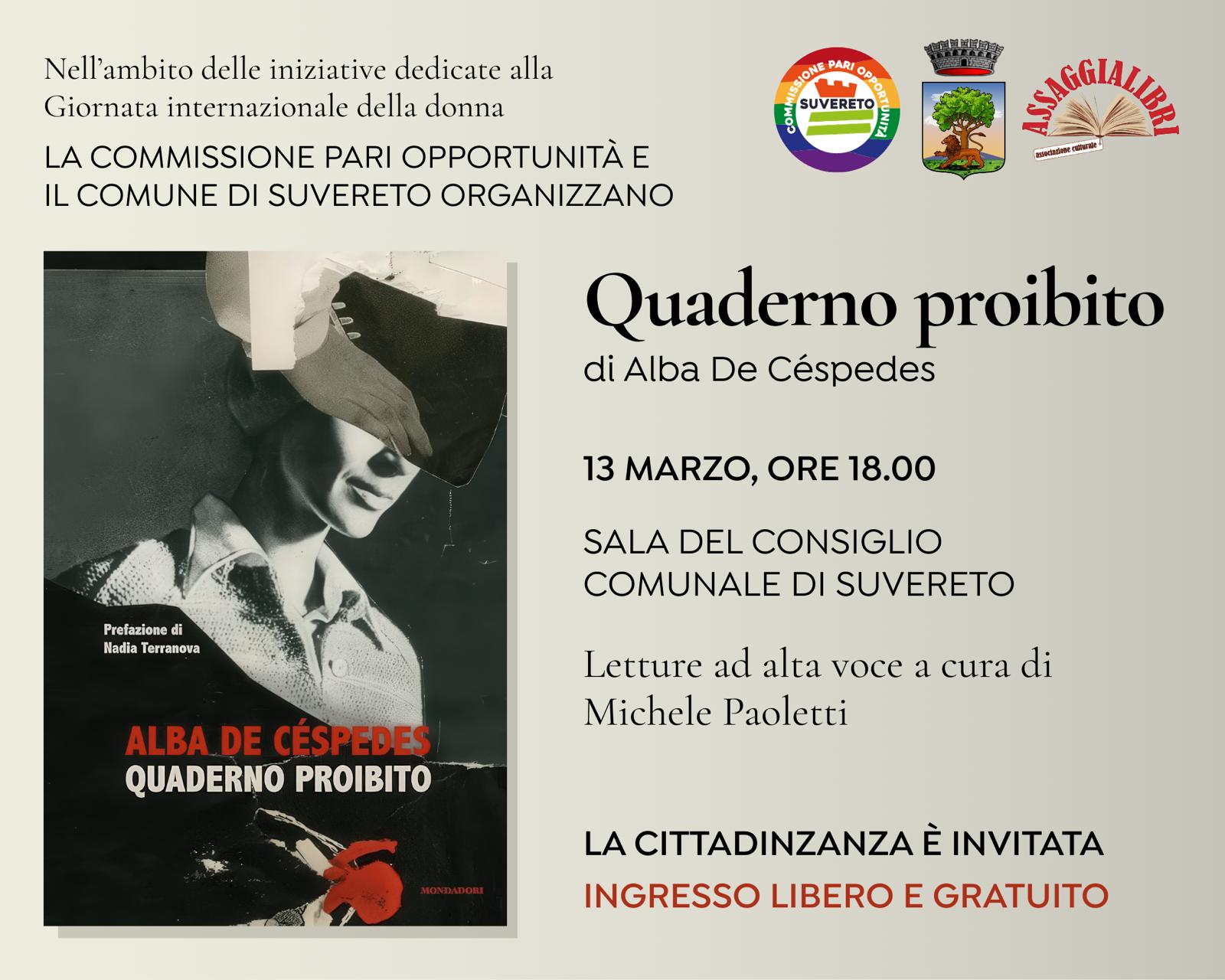 Venerdì 13 marzo alle ore 18, presso la Sala Consiliare del Comune di Suvereto, sarà proposto un omaggio a uno dei testi più significativi della narrativa italiana del Novecento: Quaderno Proibito di Alba de Cèspedes