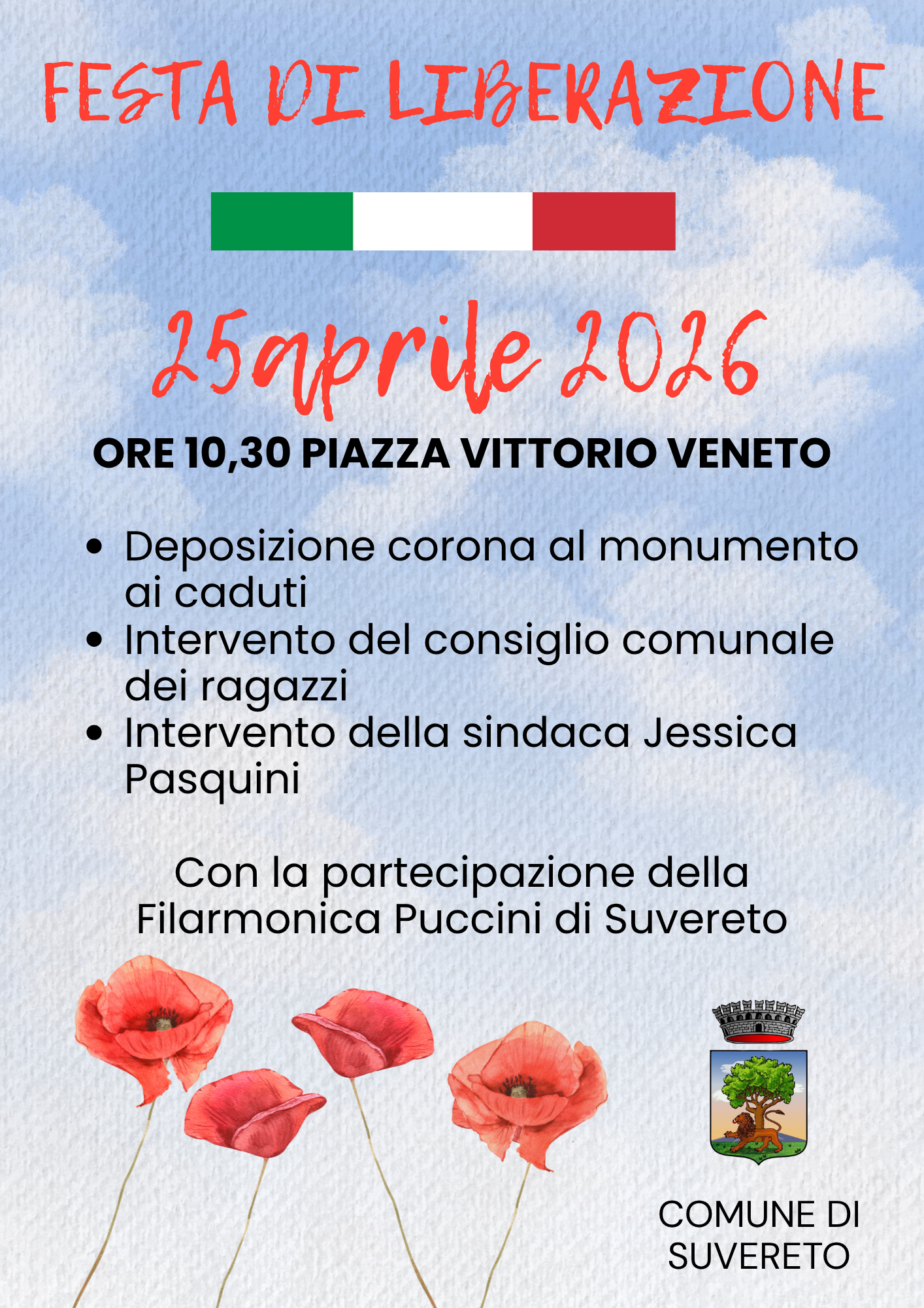L’Amministrazione Comunale invita la cittadinanza a partecipare alla cerimonia di celebrazione della Festa della Liberazione, che si terrà sabato 25 aprile alle ore 10.30 a Suvereto, in Piazza Vittorio Veneto.