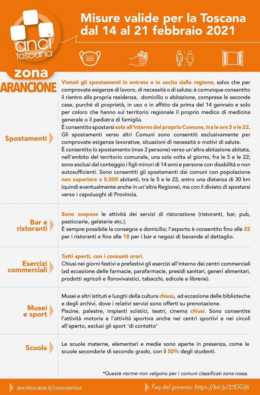 La Toscana in zona arancione dal 14 febbraio 2021. L'aumento dei contagi e, soprattutto, la crescita del Rt dovuto al rapporto dei cosiddetti 'sintomatici' all'interno dei nuovi positivi, ha provocato lo scatto in avanti delle restrizioni all'interno dei confini regionali. Di seguito un rapido riassunto sulle regole da seguire: