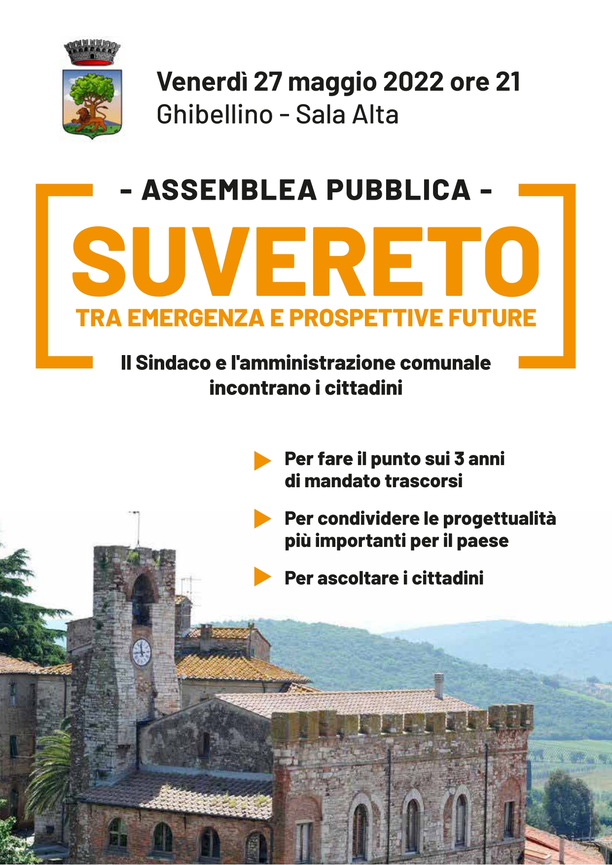 Il 27 Maggio 2022, alle ore 21, presso la sala del Ghibellino, si terrà quindi l'assemblea pubblica "Suvereto tra emergenza e prospettive future" a cui seguiranno altri appuntamenti nelle frazioni del comune.