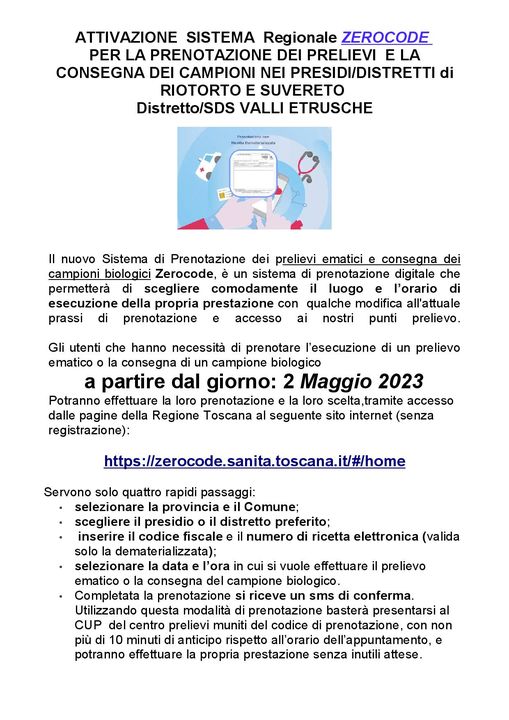 Partirà dal 2 maggio 2023, con il sistema di prenotazione on line “ZEROCODE”, la nuova organizzazione dei prelievi nel Centro Socio Sanitario di Suvereto