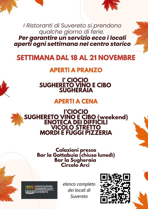 Terza settimana di novembre con l'informativa su tutti i locali che, nonostante le chiusure diffuse del periodo, garantiscono servizio pranzo, cena e colazioni.