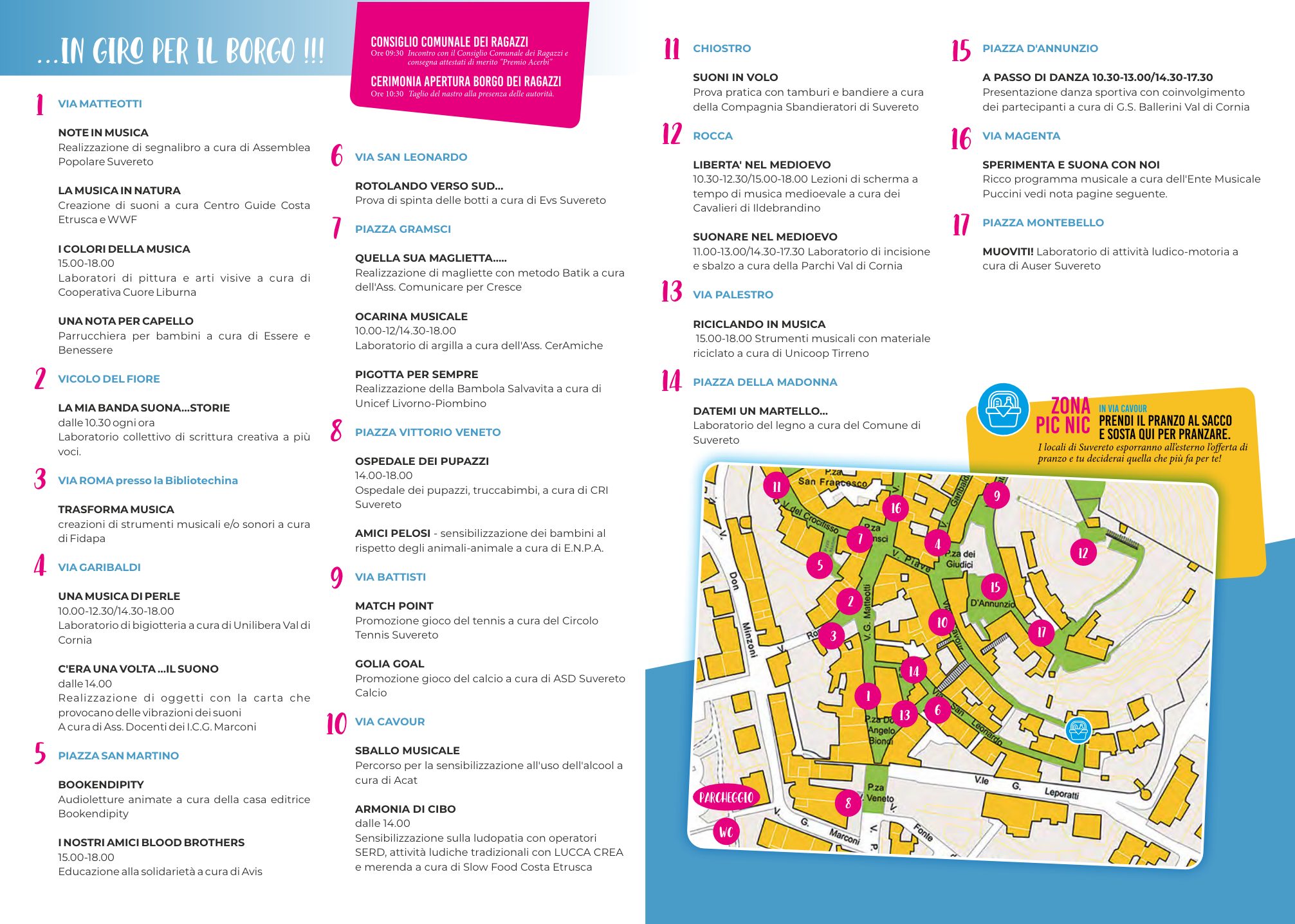 Come ogni anno tante sono le associazioni presenti, tanti i laboratori dedicati al tema musica, libri, giochi, divertimento e allegria. Inoltre presso il Museo della Bambola, la Parchi Val di Cornia vi aspetta per creare la bambola di carta di Violetta protagonista della "Traviata" di Giuseppe Verdi.