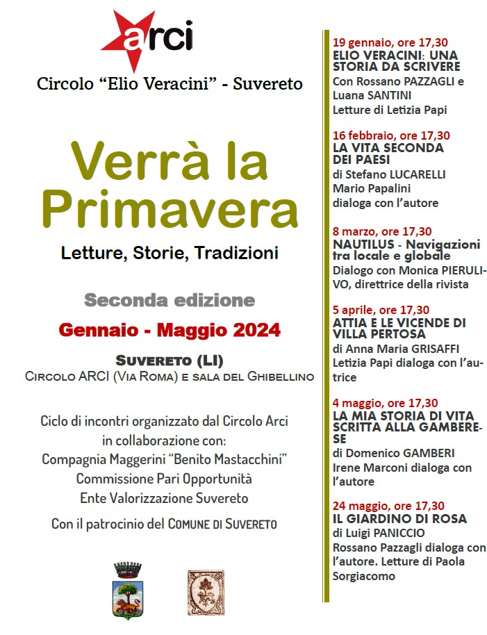 Verrà la Primavera. Libri, storie, tradizioni. Si chiama così il ciclo d'incontri organizzato dal Circolo Arci di Suvereto in collaborazione con: Compagnia Maggerini ''Benito Mastacchini'', Commissione Pari Oppurtunità ed Ente Valorizzazione. Con il Patrocinio del Comune di Suvereto.