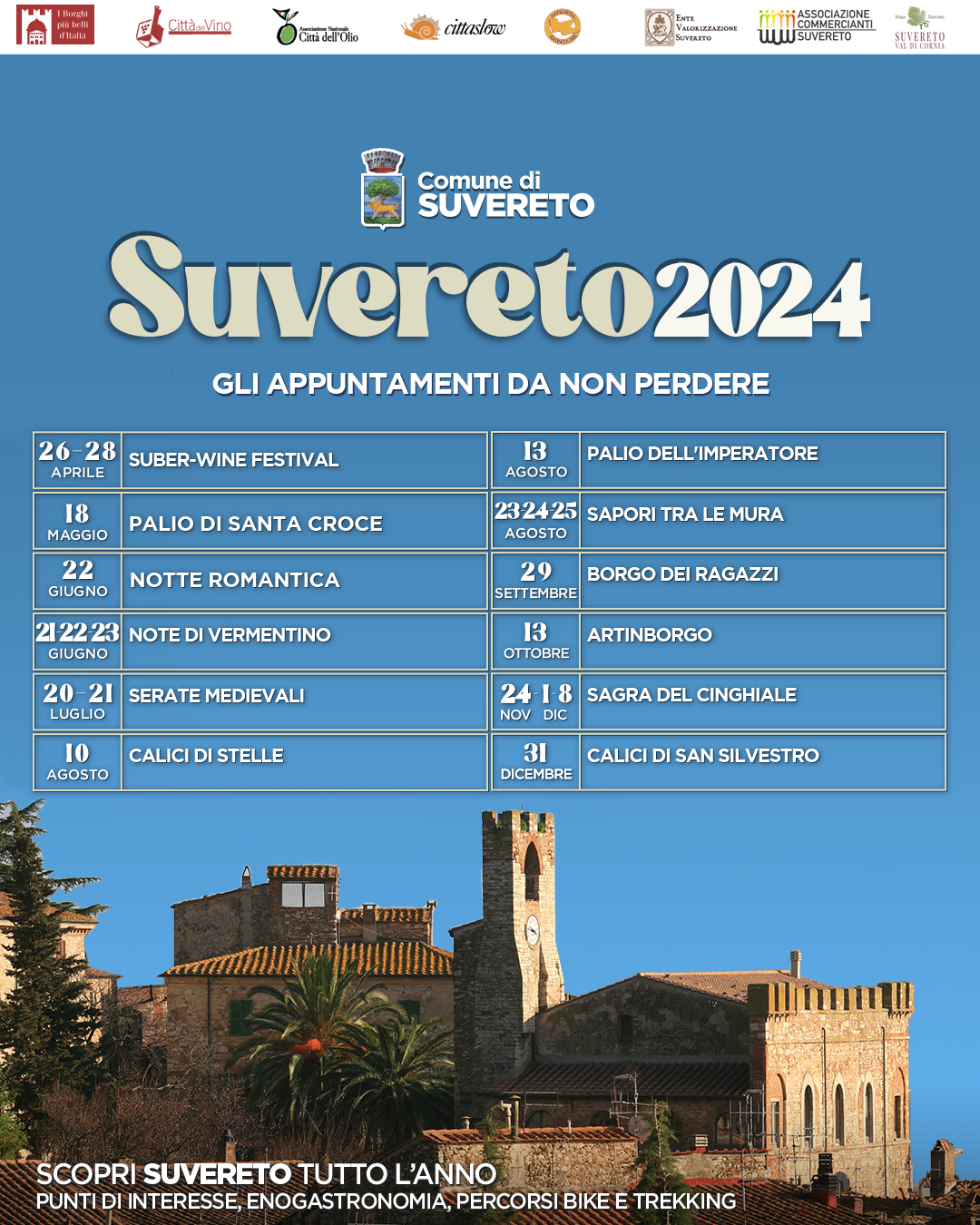 Conferme e novità si alternano nel cartellone dei maggiori eventi 2024 che il Comune di Suvereto, insieme alle associazioni del suo territorio, ha già predisposto in modo da pubblicizzare al meglio e per tempo le iniziative.