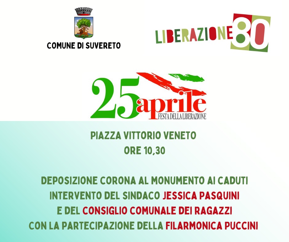 In occasione della Festa della Liberazione, venerdì 25 aprile alle ore 10:30, Suvereto si riunirà in Piazza Vittorio Veneto per commemorare l' 80° anniversario della Liberazione d’Italia.