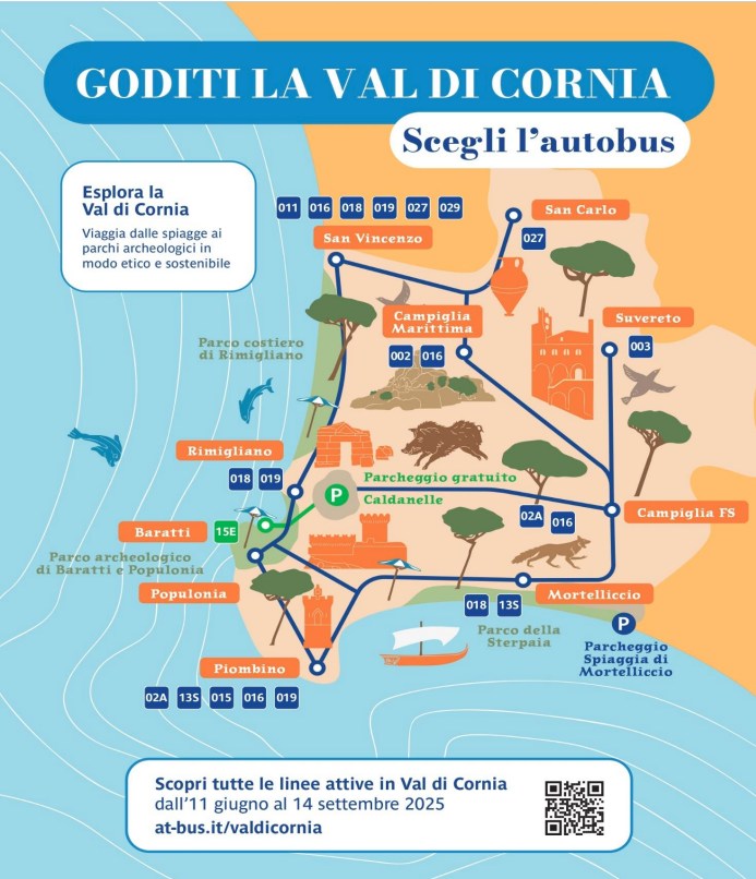 Dal 11 giugno al 14 settembre è attivo il servizio di trasporto pubblico che consente di spostarsi comodamente e in maniera sostenibile tra le località balneari e i principali parchi archeologici della Val di Cornia.