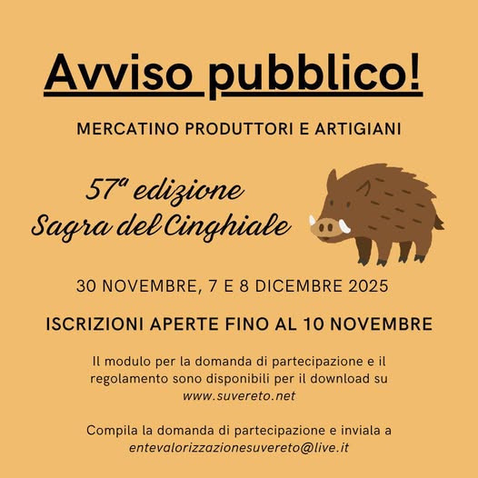 Ente Valorizzazione Suvereto rende note che in occasione della 57ª Sagra del Cinghiale di Suvereto, tornano i mercatini dedicati a produttori e artigiani locali.